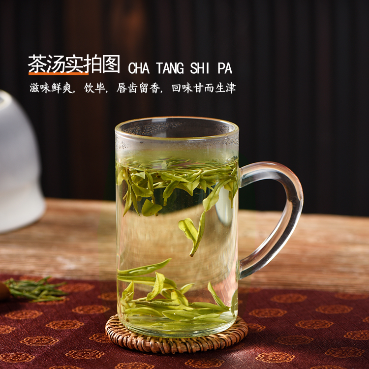 茶叶色泽鲜绿,香气清新持久,滋味鲜爽,茶汤色泽清透。